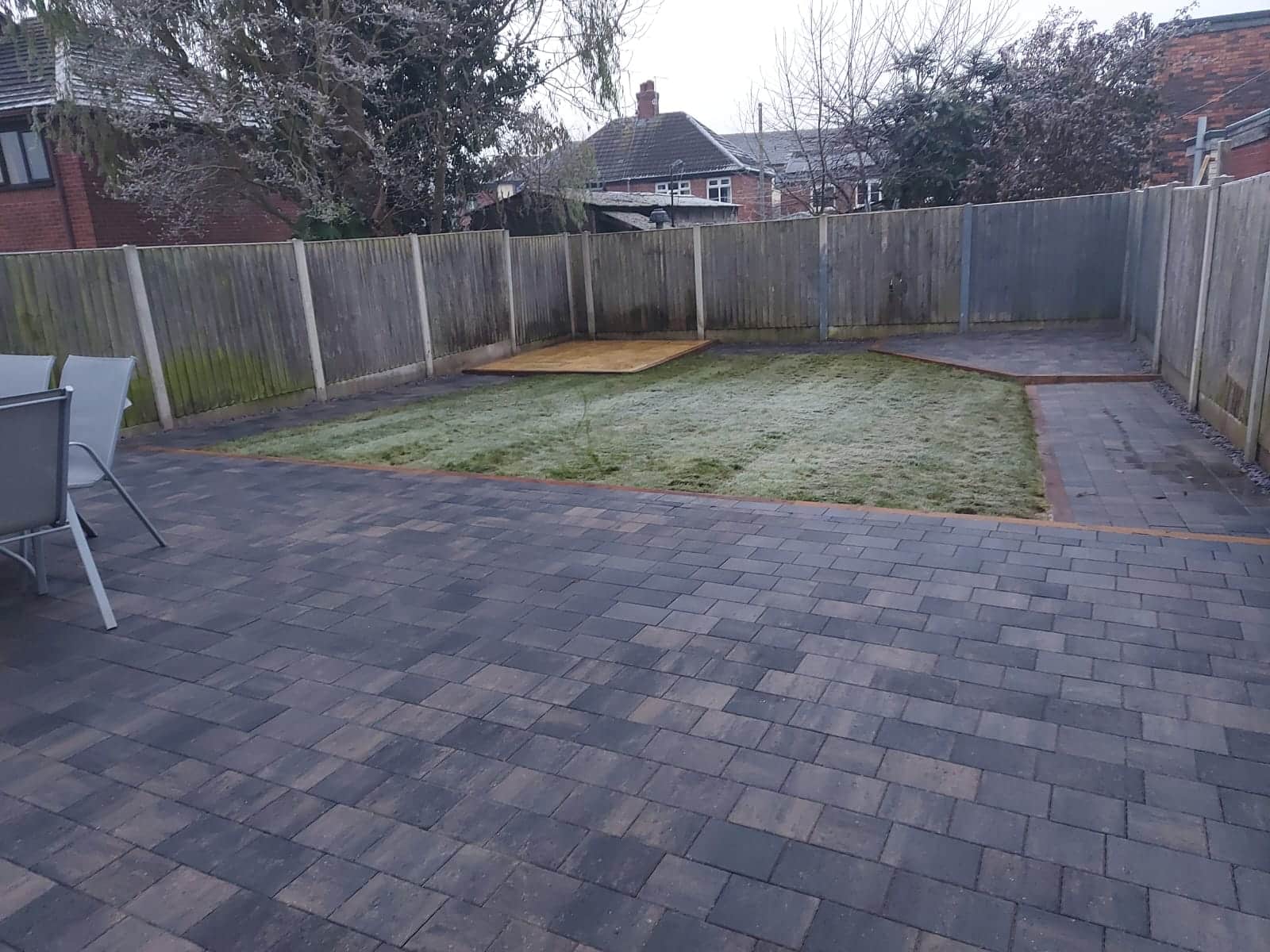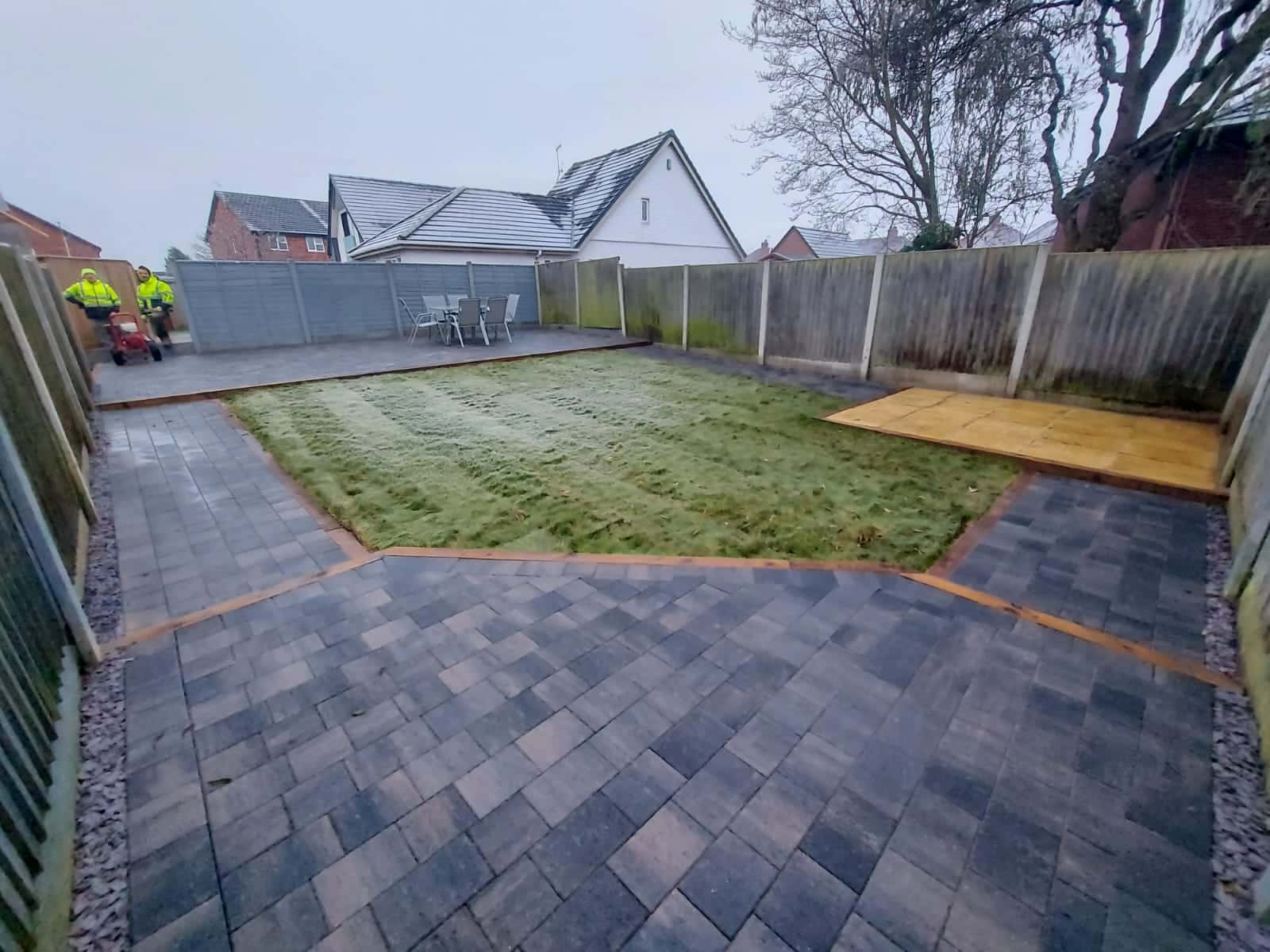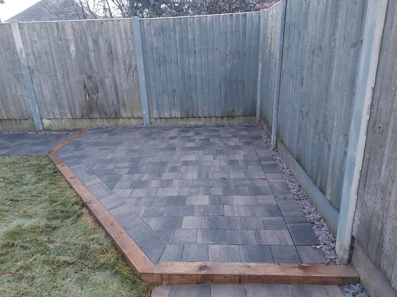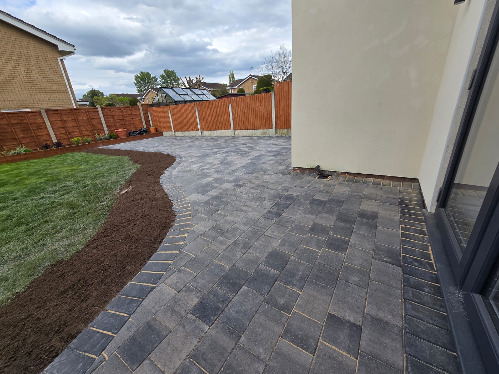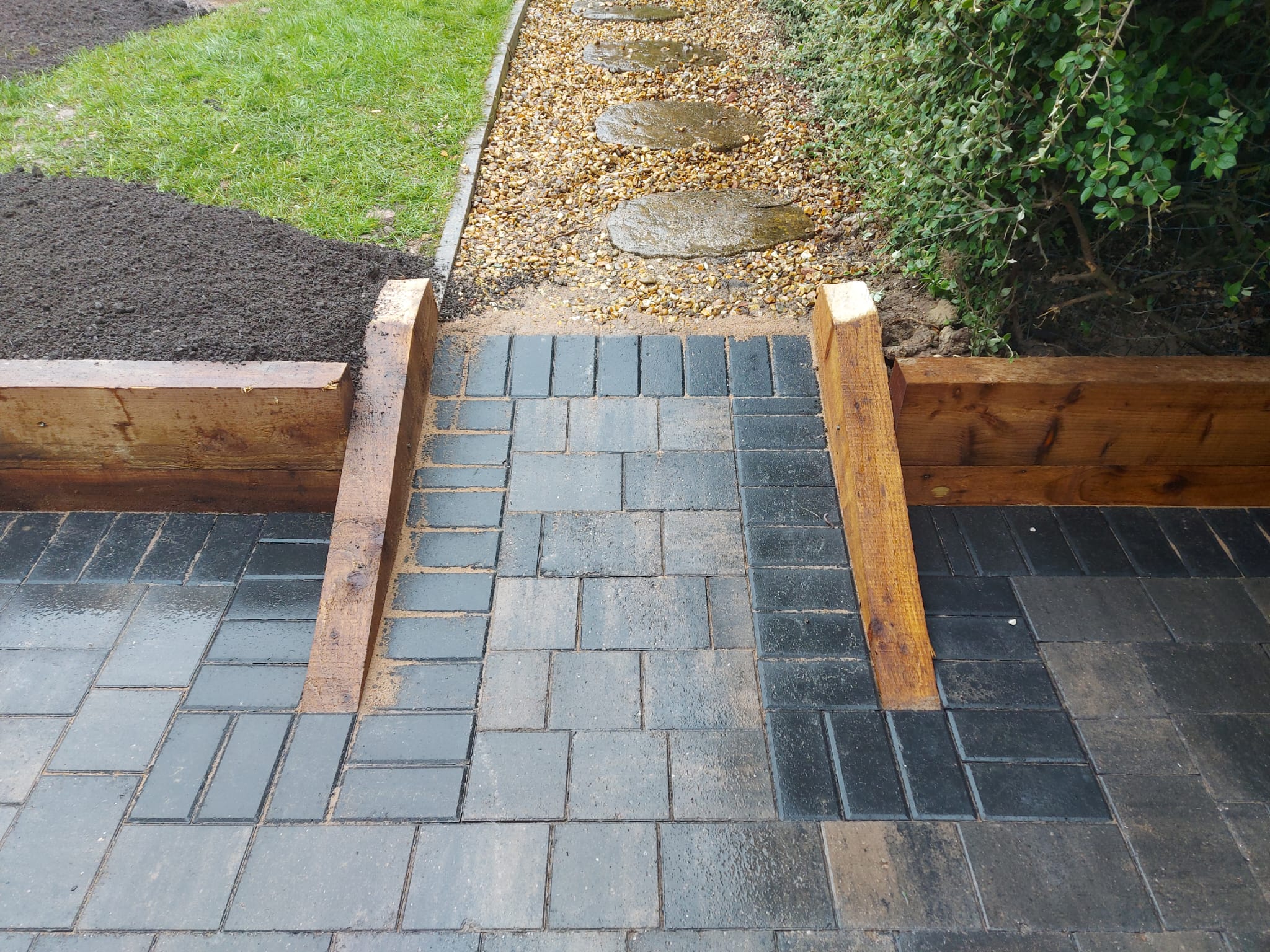 Landscaping project: turf, sleeper work, granite grey Modena patio & paths