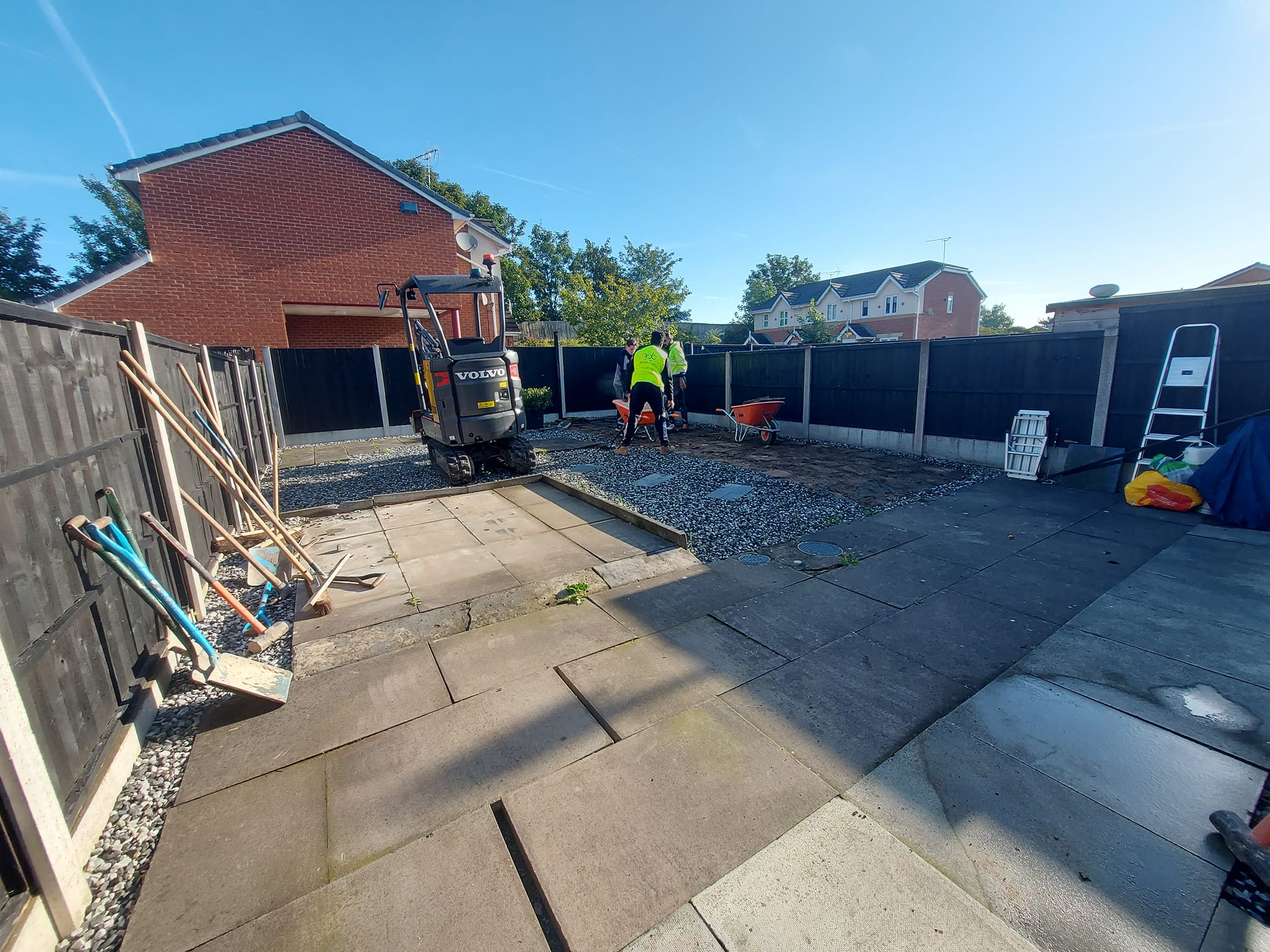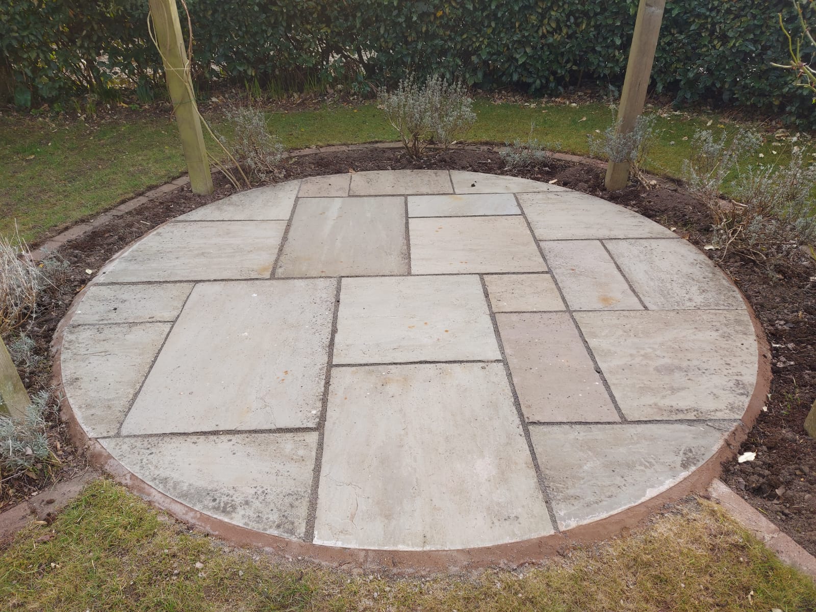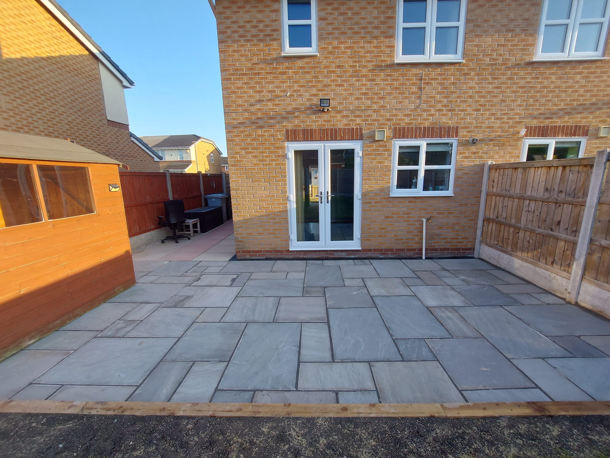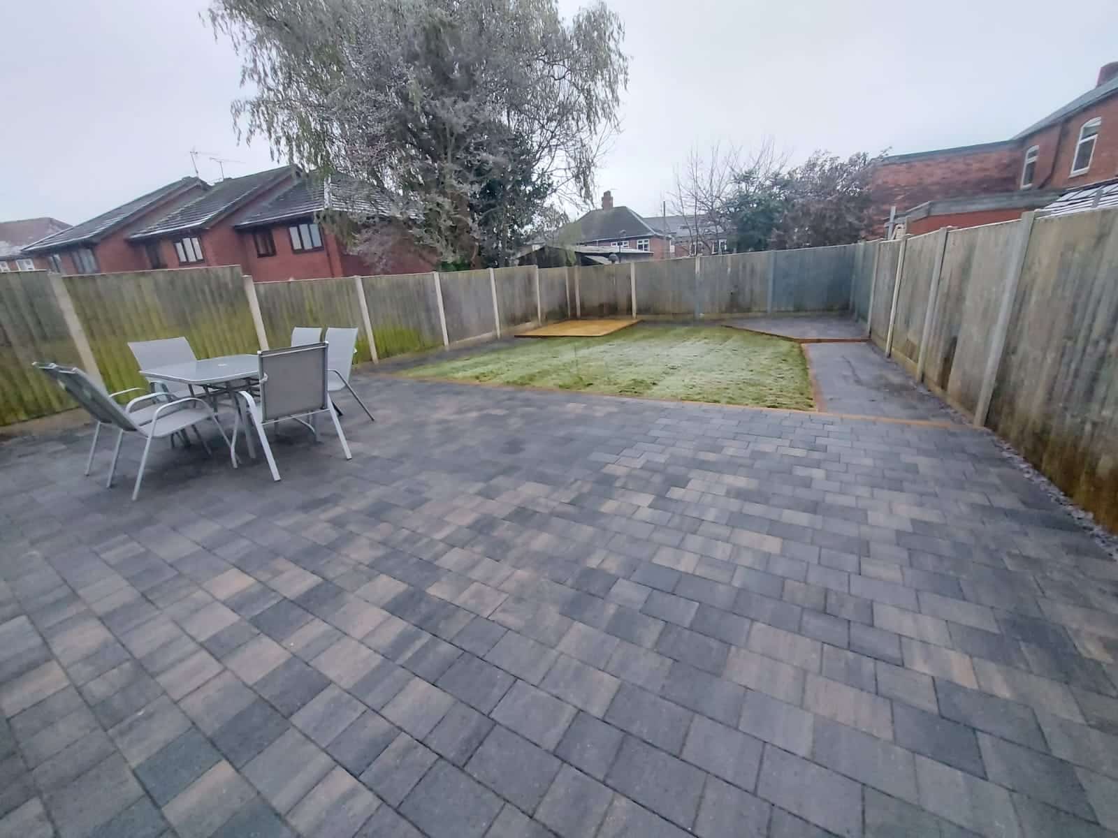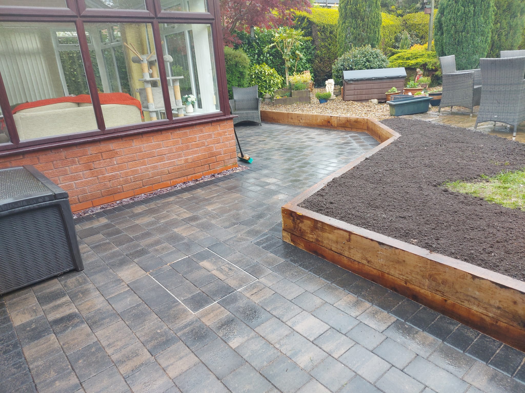 Landscaping project: turf, sleeper work, granite grey Modena patio & paths