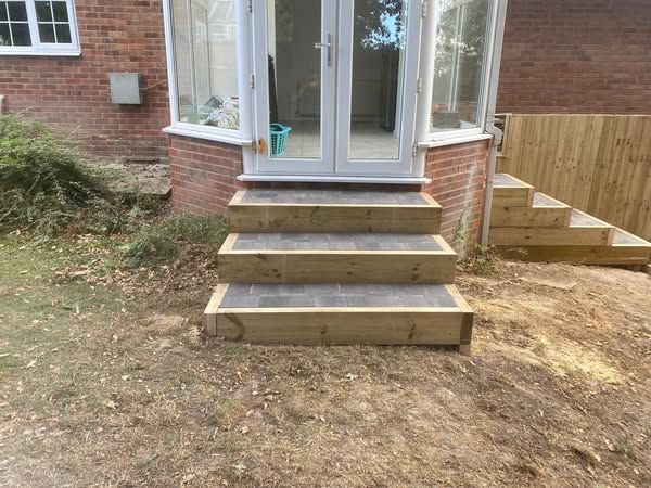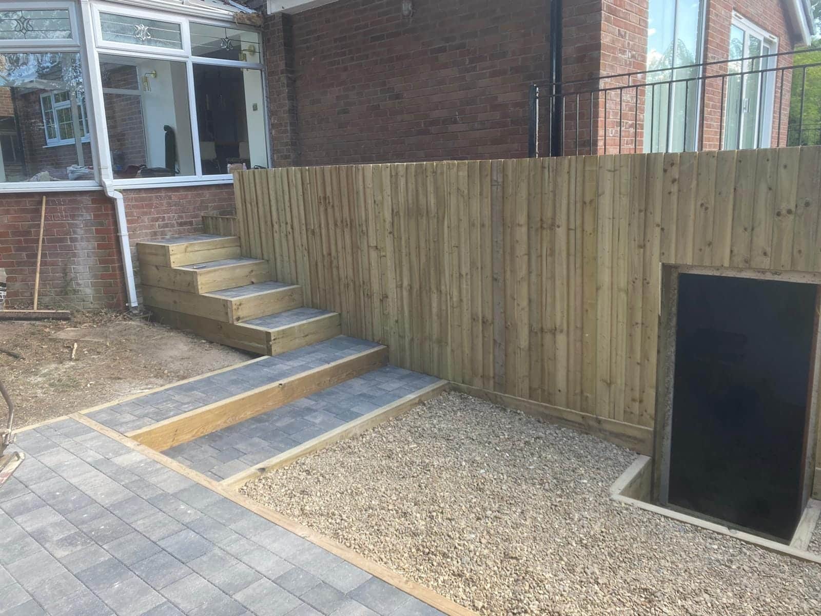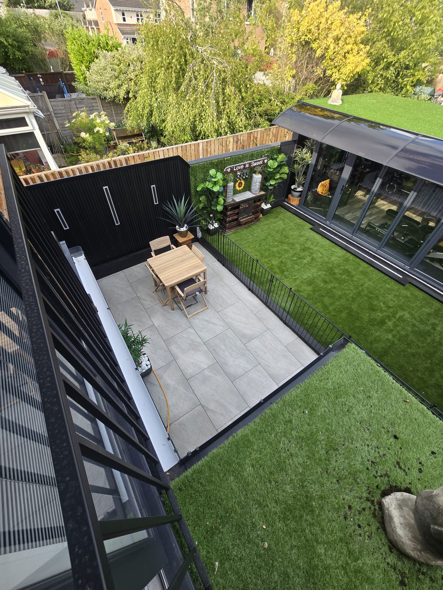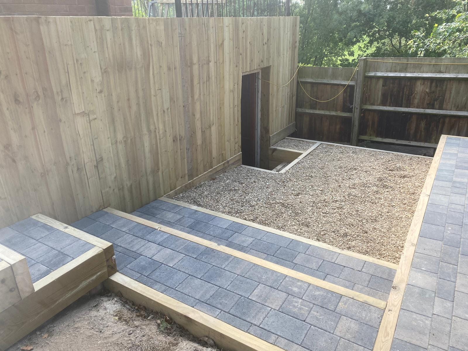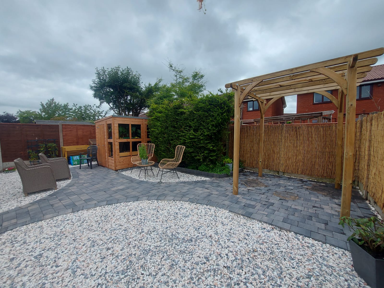 Landscaping project: turf, sleeper work, granite grey Modena patio & paths