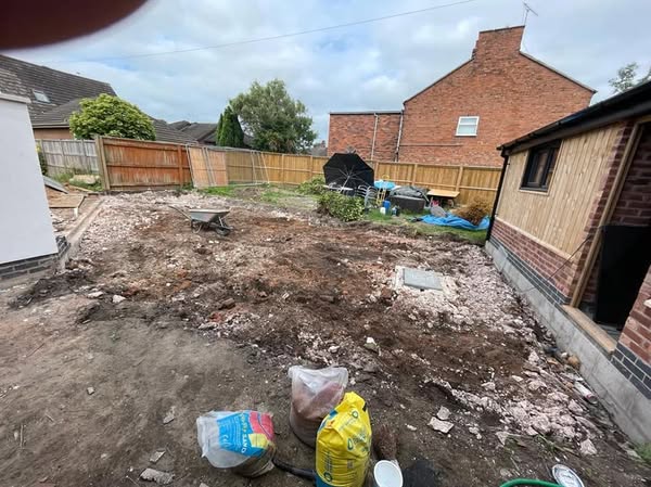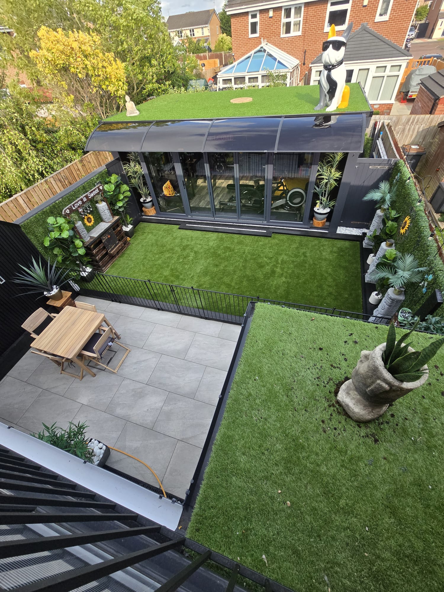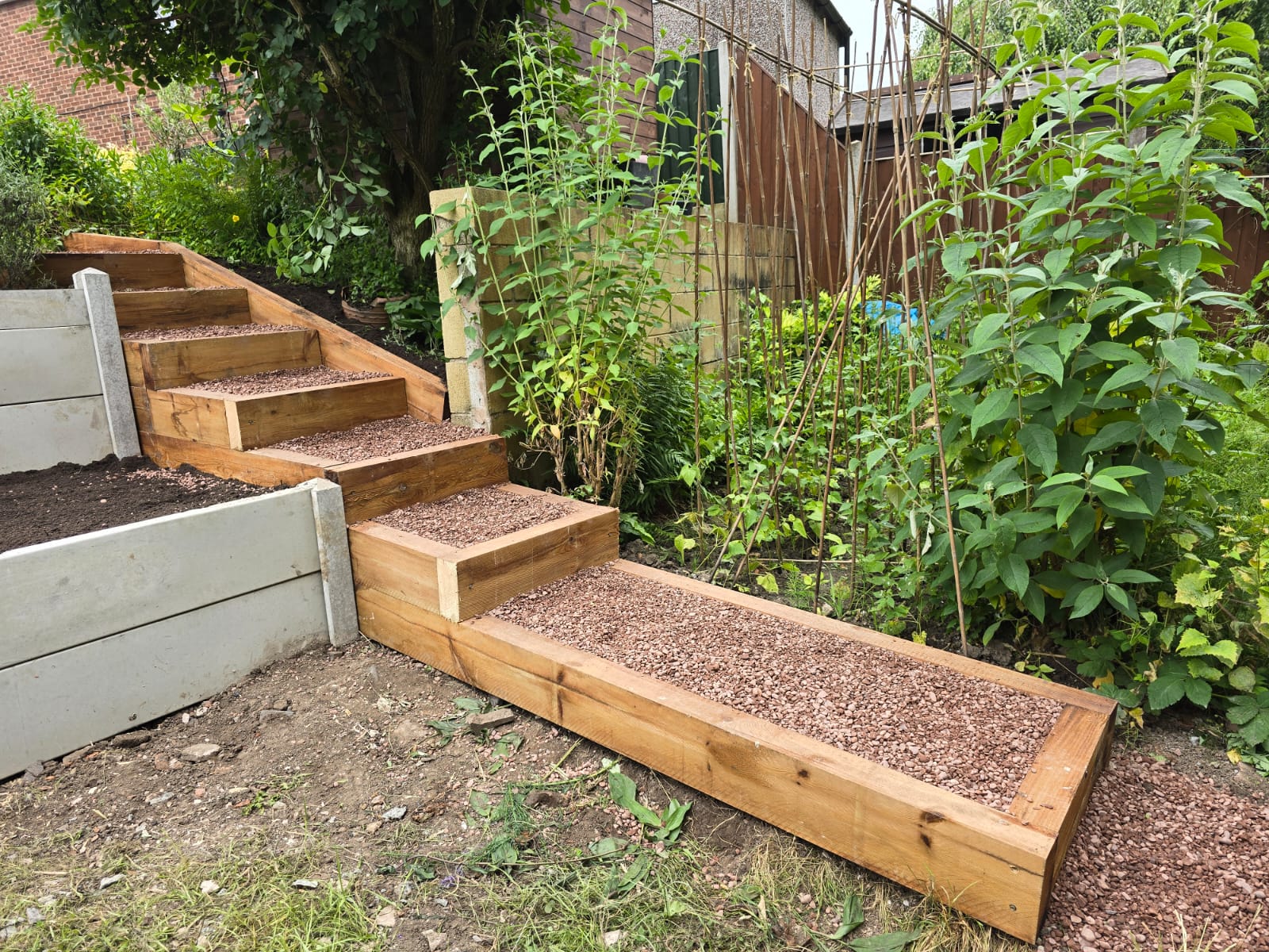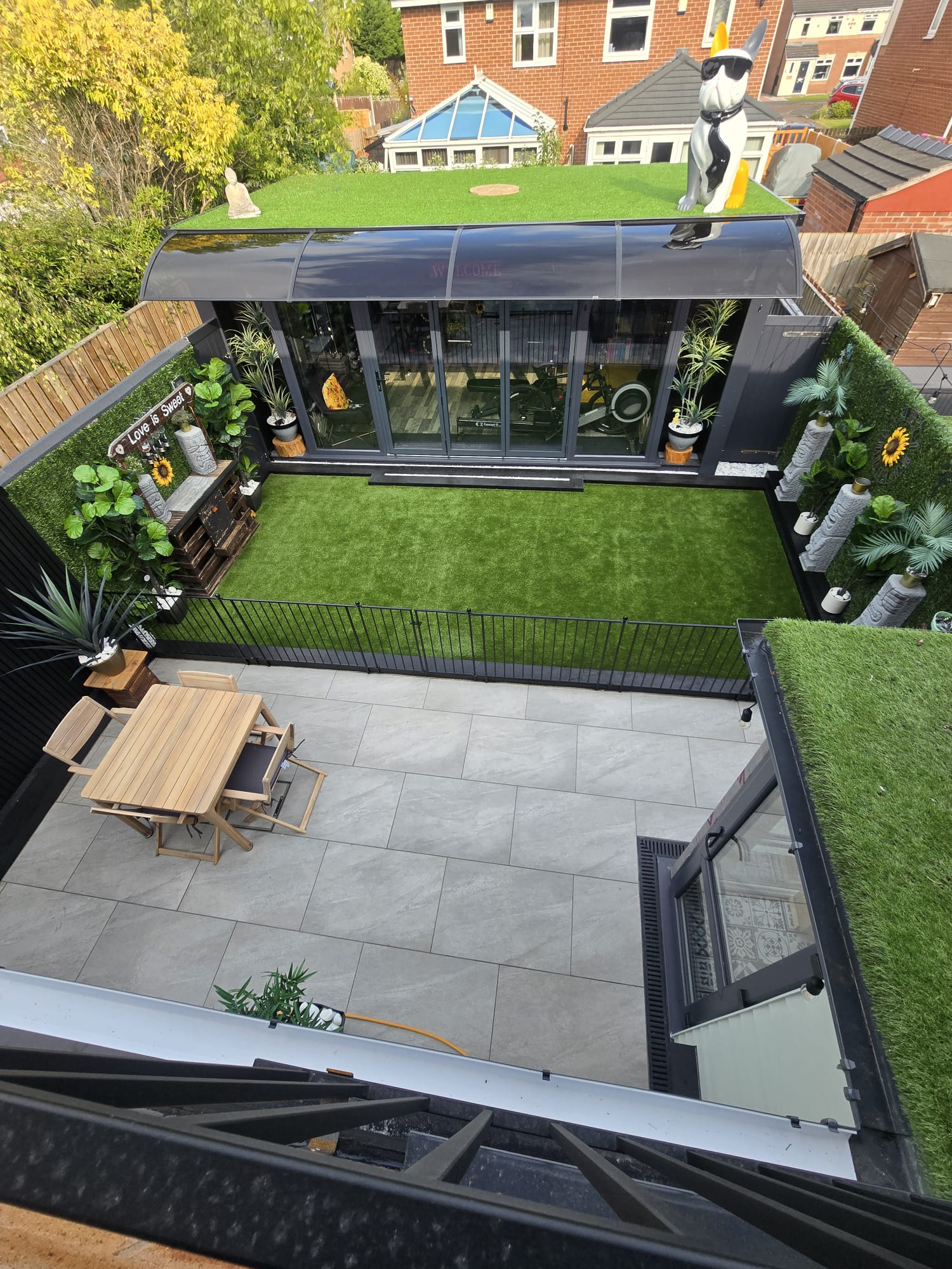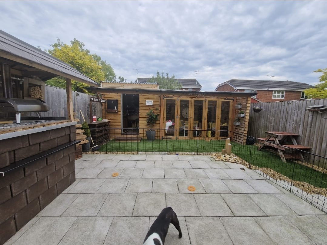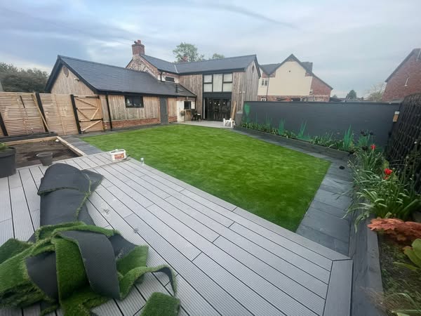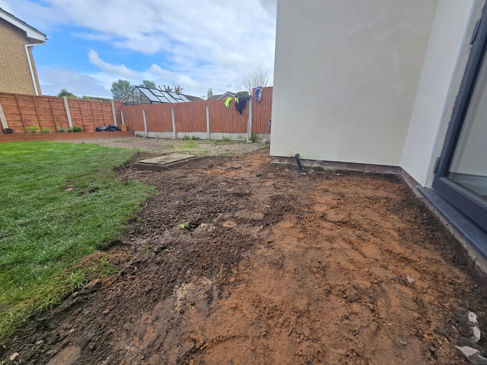 Landscaping project: turf, sleeper work, granite grey Modena patio & paths