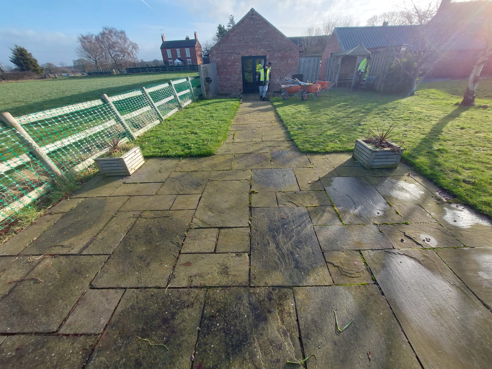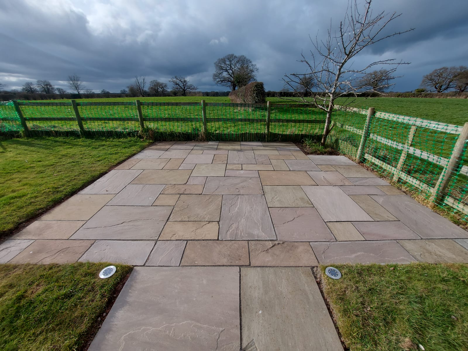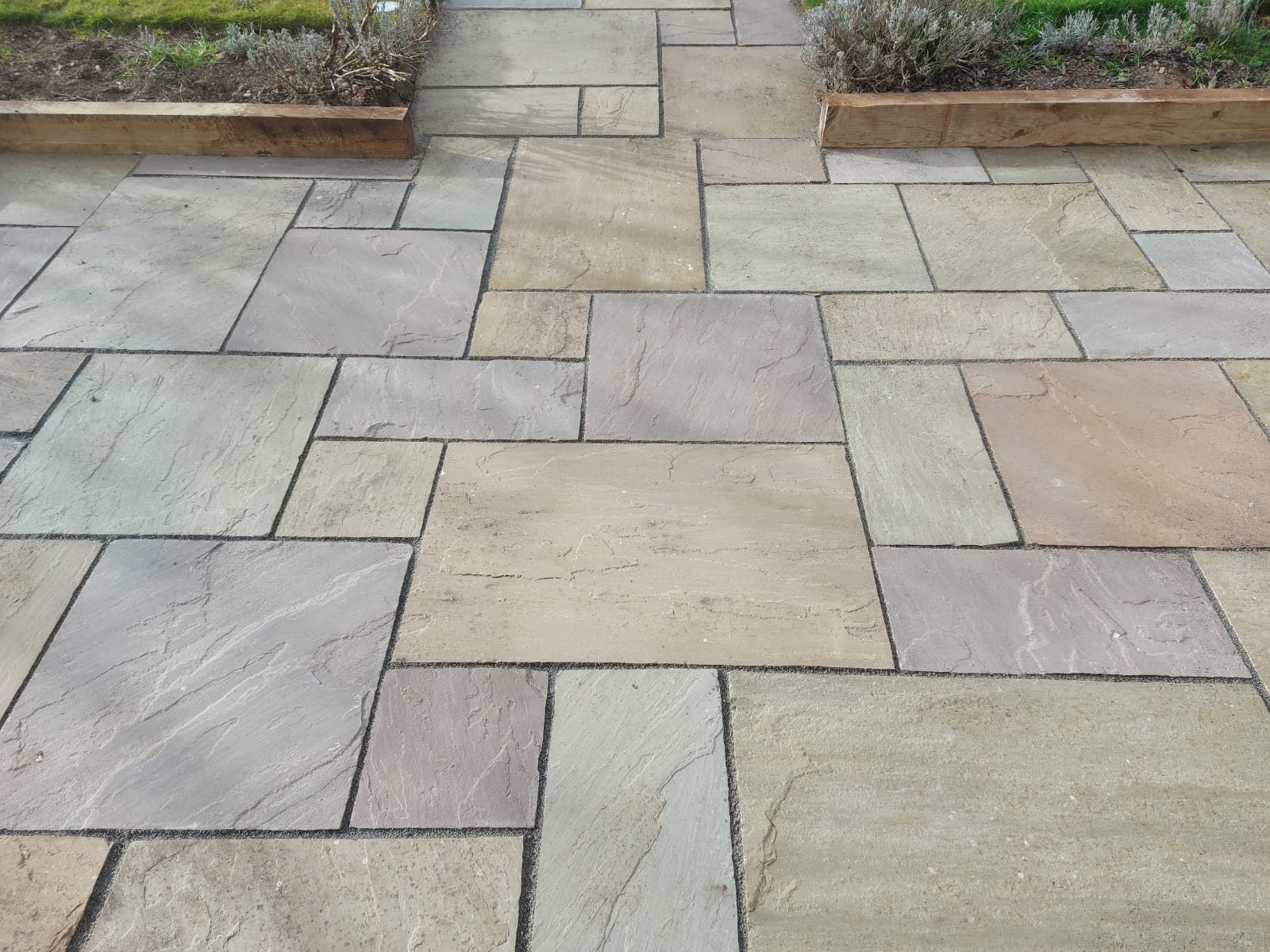 cleaned, rejoined, & relayed traditional Indian sandstone patio & path
